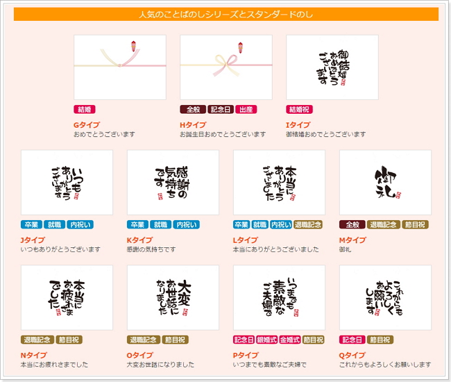 ↑このように、「本当にありがとうございました」や「いつまでの素敵なご夫婦で」などの”メッセージのし”が用意されています。
